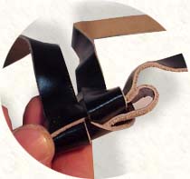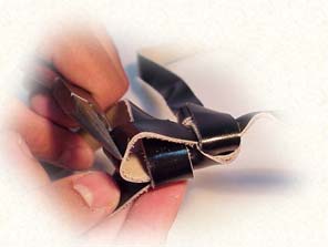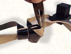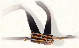 1. We will now explain how to enlarge the knot. (once you understand this, shortening the knot will be just as easy) First, taking care the tefillin is sitting on a safe, stable place, the head knot is turned on its side. Then you simply take the right curve of the "S" and pull it to the right, pulling out a length of strap from the bottom of the "S". The amount that you pull should be the amount that is needed for the enlargement. |