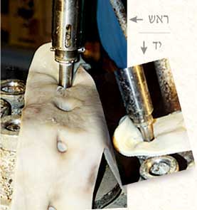 Dans le cuir destiné au Tefillin de la tête, nous formons quatre bombements qui seront utilisés pour insérer les quatre bandes de parchemin sur lequel les quatre passages Bibliques sont écrits. Après chaque operation, extension , formation des bombements... ,le cuir doit être séché à l'air frais (sans aucun appareil de chauffage ou autre moyen de sechage artificiel) pour une période de plusieurs semaines - et même des mois ! C'est pour cette raison que préparer une paire de tefillin peut durer une année. | |||||||||||
