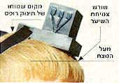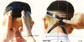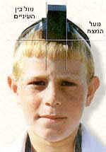 Place the tefillin on your head above the forehead, from the edge of the hairline and to the crown (the area which halacha describes as "where the head of the baby is soft.") Be careful to place the center of the tefillin exactly above the central point between your eyes. |