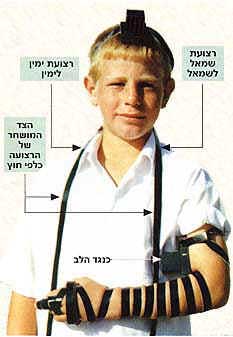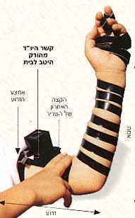 | Place your tefillin on your left arm (or on your right if you are left-handed) so that the strap-housing will face your shoulder, while the yod knot and the bayit face your heart. | ||||