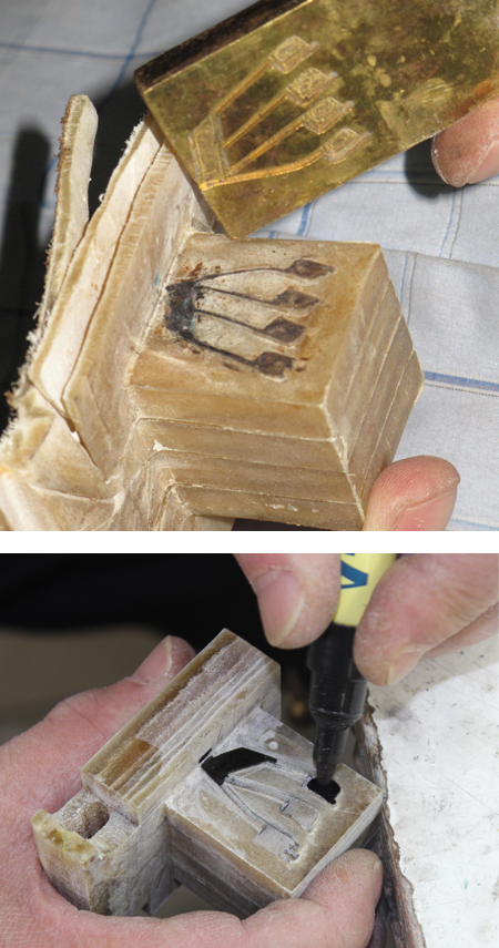 מכיוון שצריכים להוציא את האות "ש" החוצה, יש לסמן את האות על צד הבית. כעת, דוחפים אותה חזרה פנימה באמצעות ברזל חלק, ורק לאחר מכן מבליטים את האות "ש" כפי שדורשת ההלכה- ע"י משיכה ידנית כלפי חוץ.