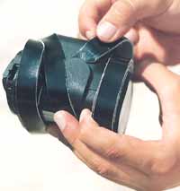 ![]() | ![]() העבר את שארית הרצועה דרך תחתית הקופסהוד לצד השמאלי של הקופסהוד, ולפף אותה על מסלול הדופן השמאלית. ![]() הכנס את קצה הרצועה לאחד התפסים שבקצה הקופסהוד, או לחלופין קבע את הקצה באחת הרצועות המלופפות. | ![]() |